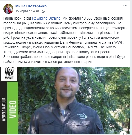 350 доноров пожертвовали 19 300 евро. На собранные экологами деньги планируют снести плотины на реке Когильник в Дунайском биосферном заповеднике (Одесская область), что позволит восстановить экосистему региона.